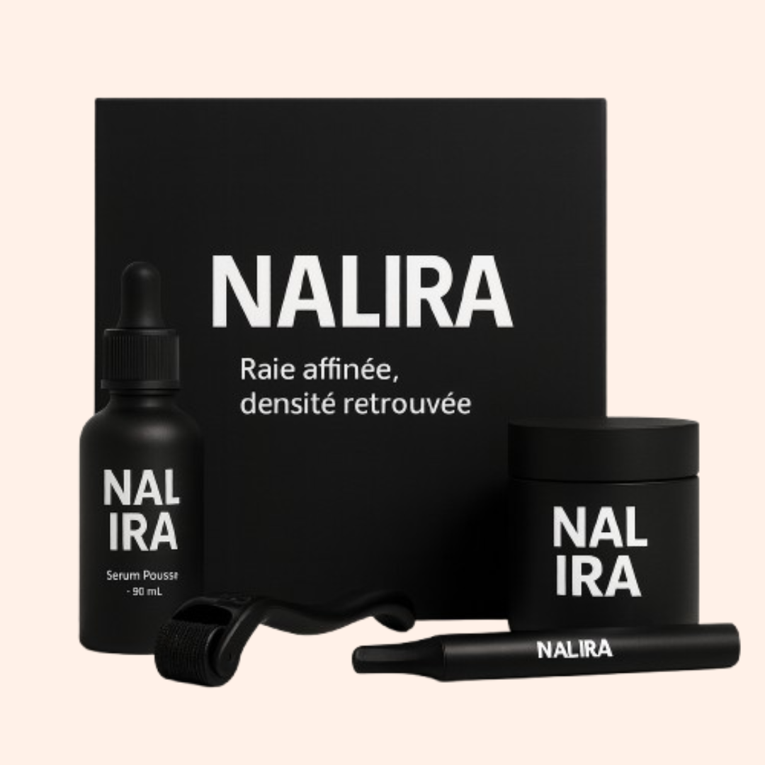 Le Coffret Signature réunit le Sérum Pousse 60 mL, un derma-roller avec étui, la poudre capillaire 15 g et un pinceau de précision.